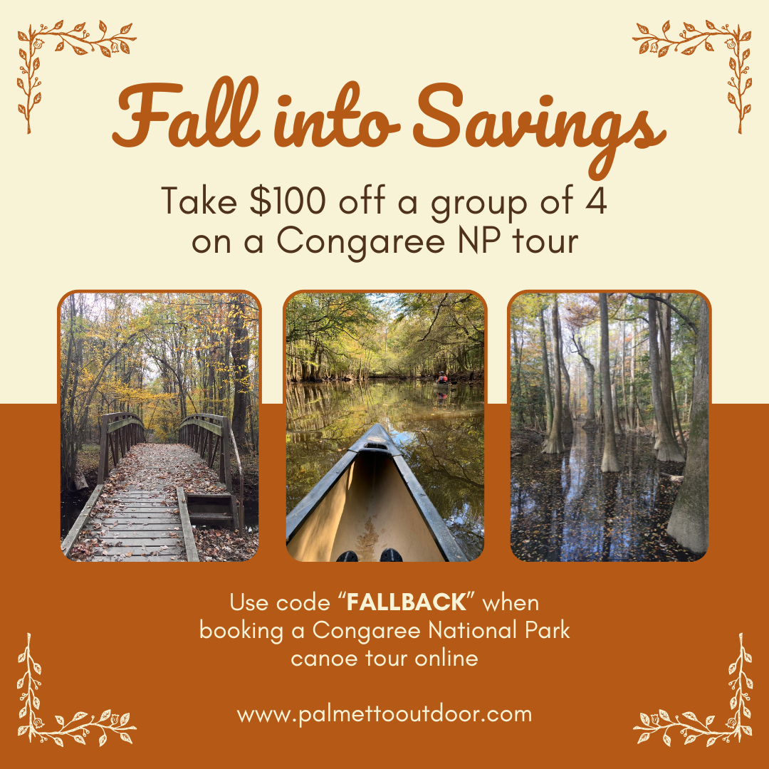This Fall, Palmetto Outdoor is making tours more accessible than ever. We are offering $100 off a group of 4 or more, and $200 off a group of 8 or more. This is the best deal from anyone that offers tours at Congaree National Park.